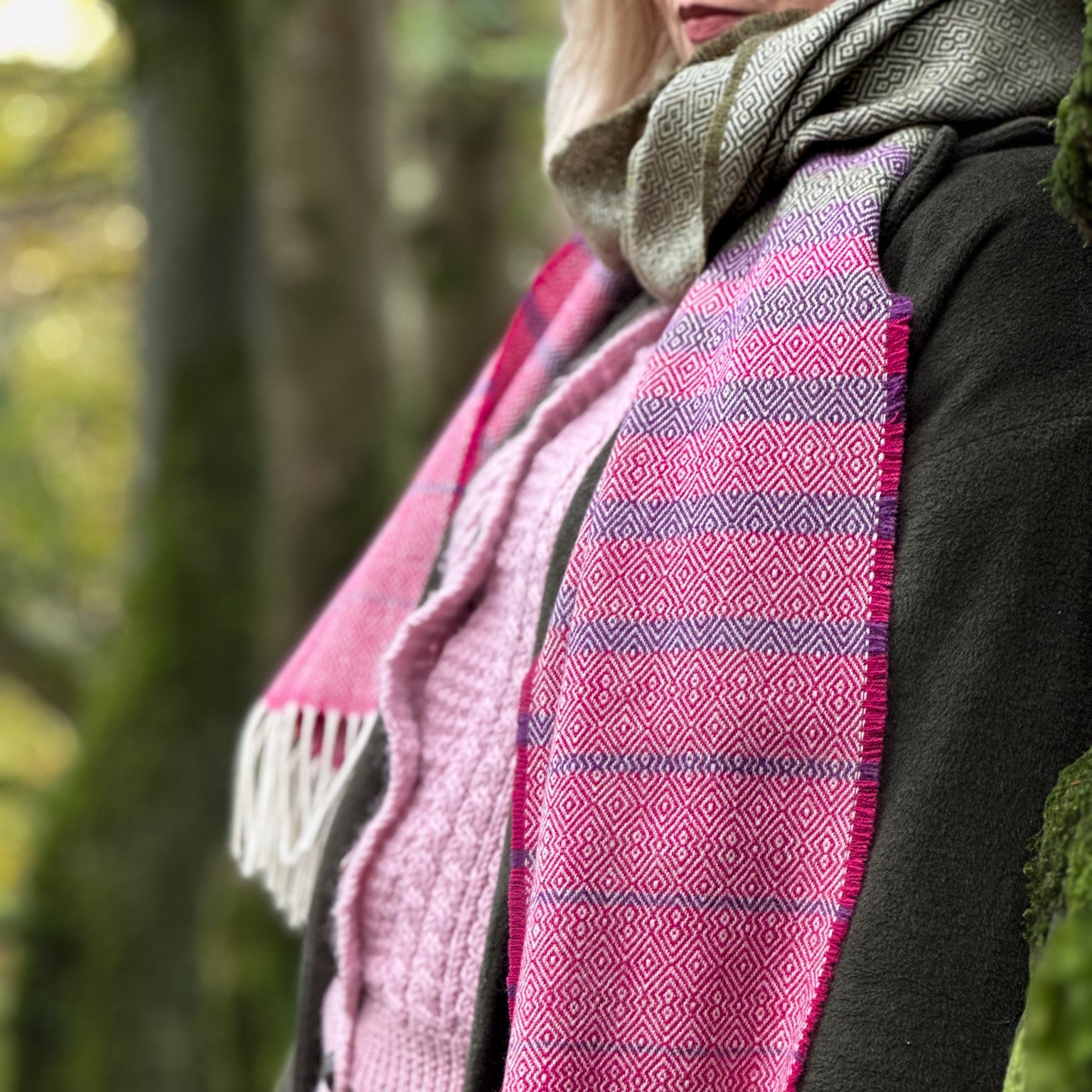 This scarf is a tribute to that day — It’s woven from the greens of the moss, the pink/purples of the heather— a piece of Donegal, wrapped in the stories that have been passed down, from my father’s hands to mine, and now to the next generation.