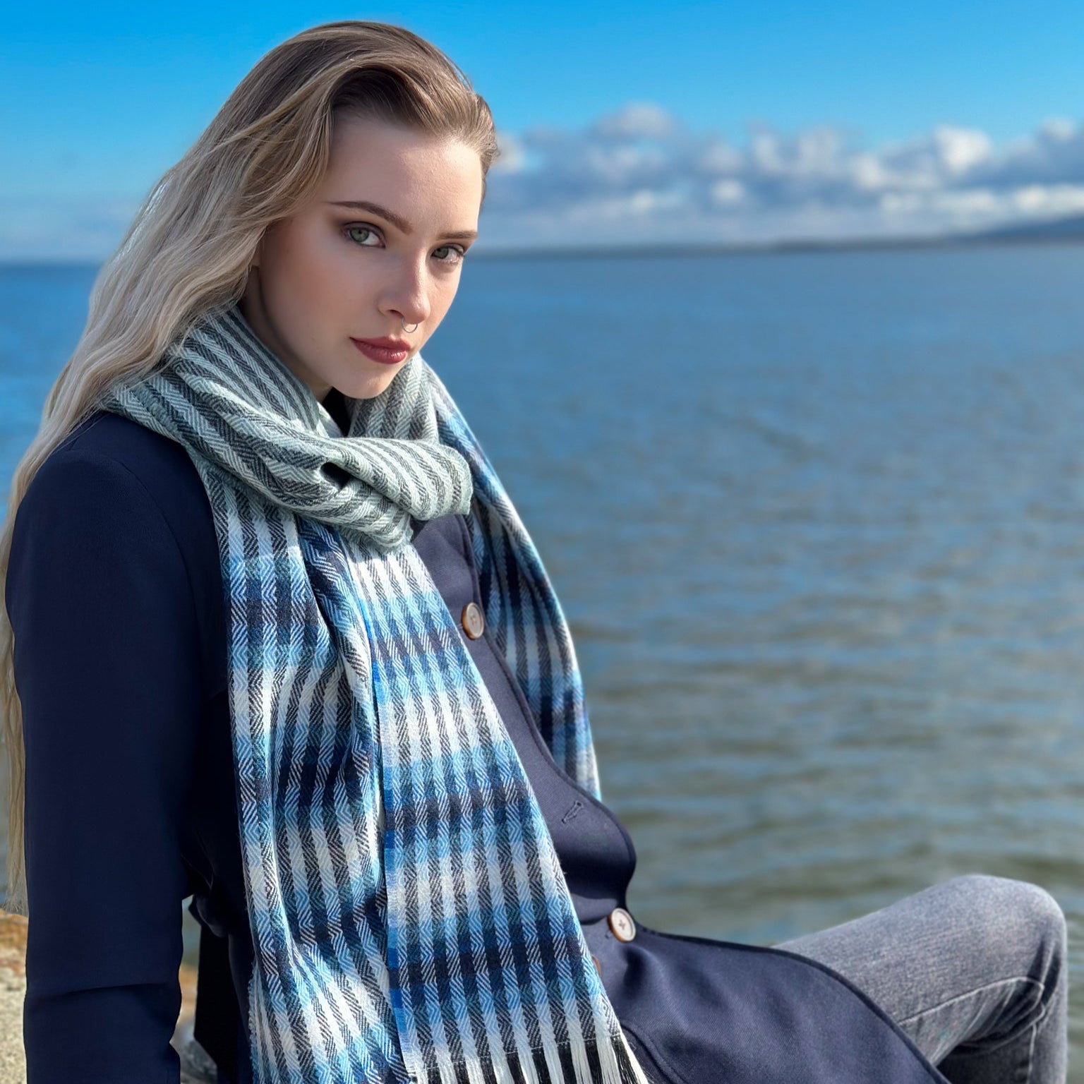 The pattern captures the rhythm of the ocean, with gentle ripples woven into every thread. This scarf is a reminder of the powerful beauty that surrounds us along the Irish coastline – timeless, wild, and always changing.